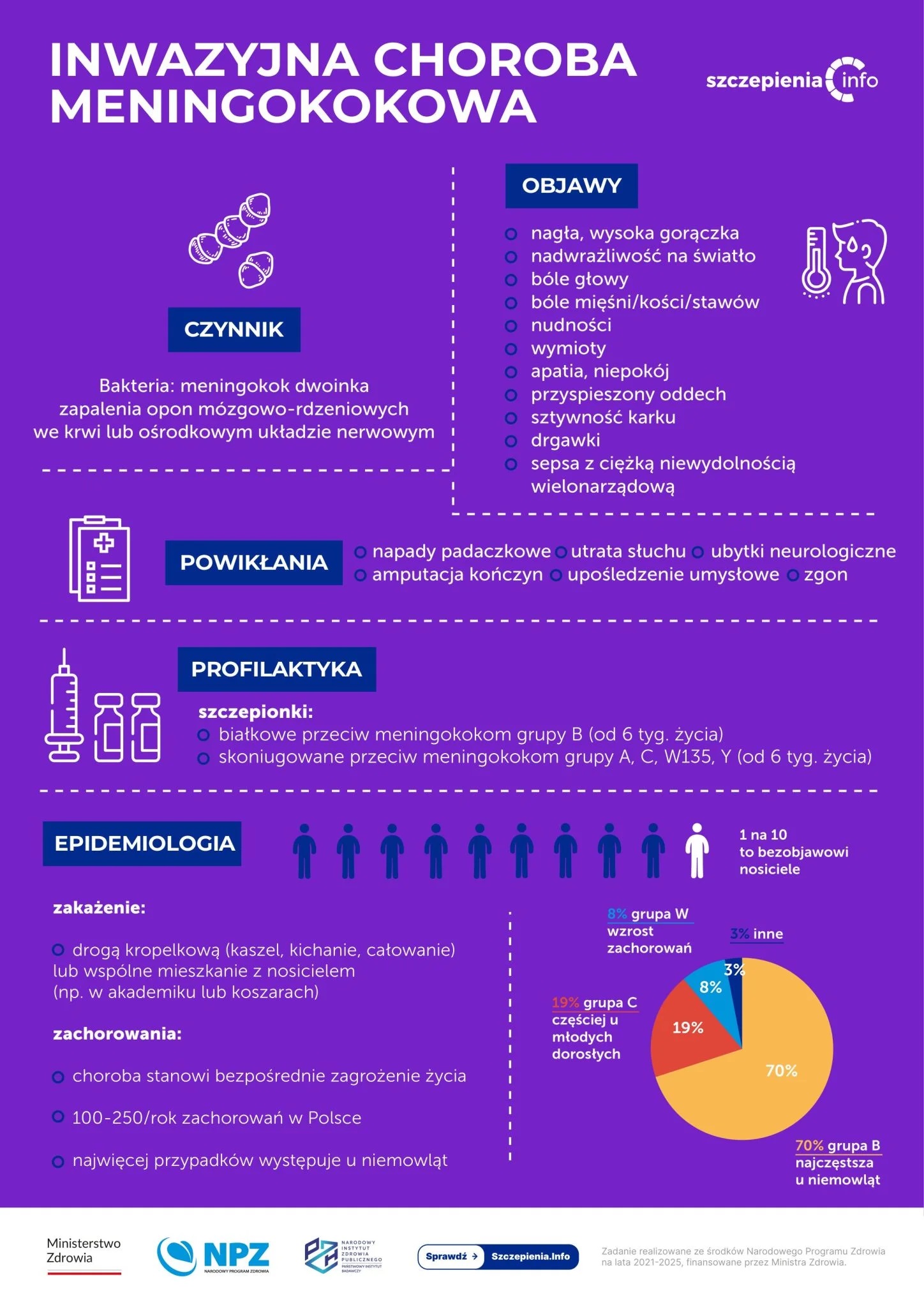 - meningokoki przenoszą się podczas kaszlu, kichania lub bliskiego kontaktu (np. pocałunku), - IChM (inwazyjna choroba meningokokowa) stanowi stan bezpośredniego zagrożenia życia i wymaga natychmiastowej hospitalizacji, - w Europie najczęściej odpowiadają za nią serogrupy B i C, a w ostatnich latach rośnie udział serogrupy W, - rocznie na świecie odnotowuje się ok. 1,2 mln zachorowań na IChM, z czego 135 tys. kończy się zgonem, - w Polsce rejestruje się ok. 150–200 przypadków rocznie, głównie związanych z serogrupą B, szczególnie u dzieci poniżej 1. roku życia.Dostępne są skoniugowane szczepionki przeciw meningokokom (monowalentne – przeciw serogrupie C, lub czterowalentne – przeciw serogrupom A, C, W, Y) oraz szczepionki białkowe przeciw serogrupie B. Skoniugowane preparaty, zawierające polisacharydy połączone z białkiem nośnikowym, mogą być stosowane już od 2. miesiąca życia.
